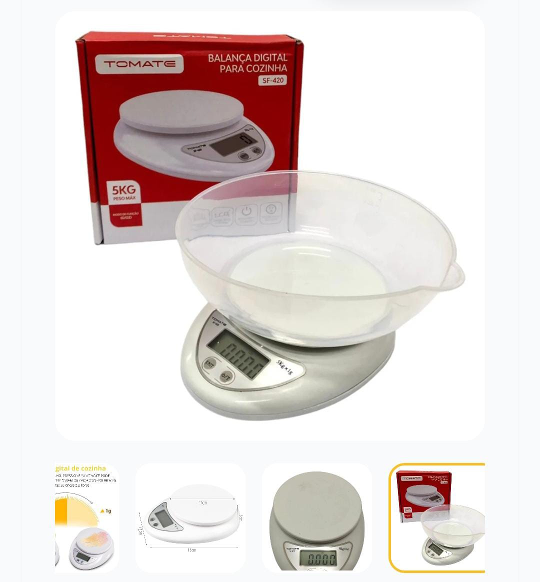 Características principais Marca Tomate Linha Balança Digital Modelo SF-420 Cor Branco Capacidade máxima 5 kg Outros Modelo detalhado Balança Tipo de balança Digital Sensibilidade da balança 1 g Tipos de alimentação Pilha Tamanho da pilha AAA Inclui recipiente Sim Inclui pilhas Sim Quantidade de pilhas 2 Material do recipiente Plástico Com função tara Sim Esta balança é indicada para alimentos e líquidos, pois possui um recipiente que permite medir volumes líquidos. Podendo ser usada para academias e cozinhas. ESPECIFICAÇÕES TÉCNICAS – peso suportado 5kg – faixa/pressão : 7kg / 1g, 5kg / 1g, 3kg/ 1g, 3kg / 0.5g, 3kg / 0.1g, 1kg / 0.1g – alimentação 2 pilhas AAA (INCLUSO) – tensão de funcionamento 2.4v – 3.5v Conteúdo da Embalagem: 1 balança, 1 recipiente Garantia: 30 dias