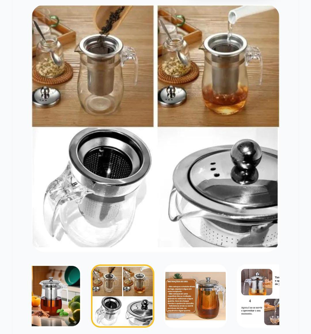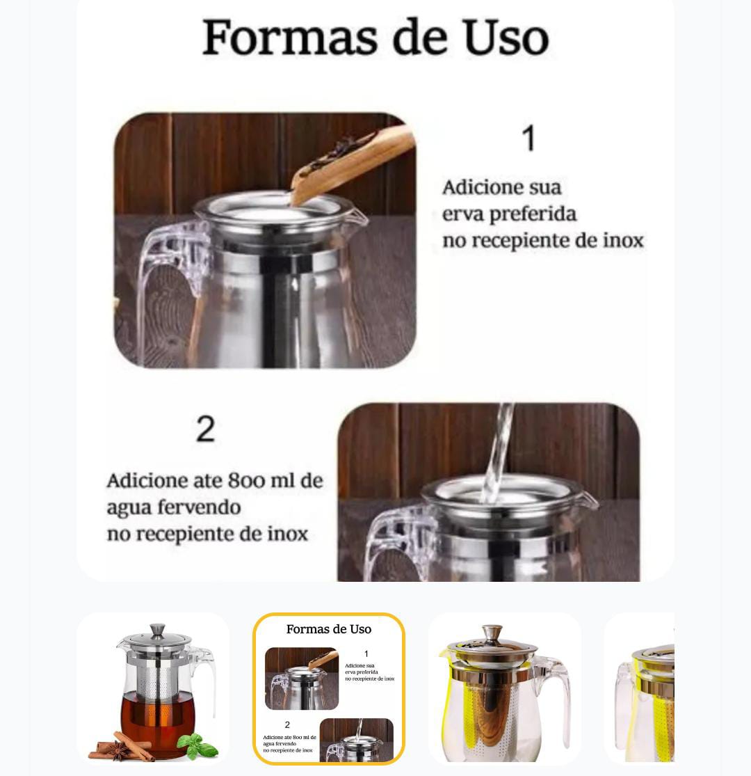 Prepare seu chá de forma prática e elegante com esta chaleira de vidro com infusor integrado. Ideal para folhas soltas ou saquinhos de chá, ela garante infusão perfeita e sabor intenso. Características: Capacidade: 500ml Infusor removível em aço inox Vidro resistente ao calor Design moderno e elegante Fácil de limpar e usar Perfeita para seu momento de relaxamento, para receber amigos ou presentear.