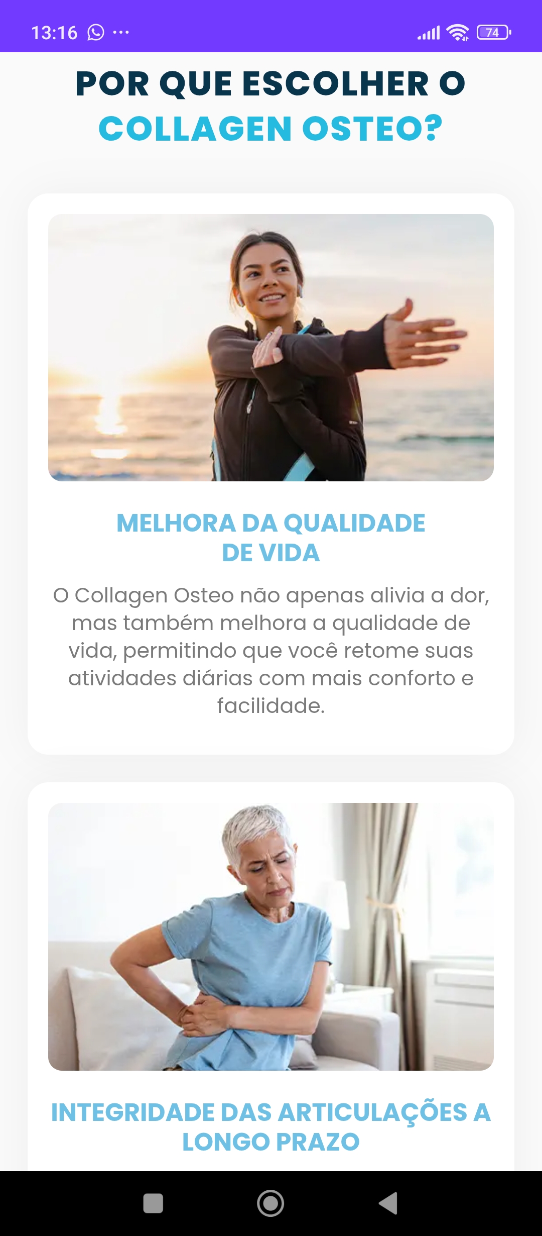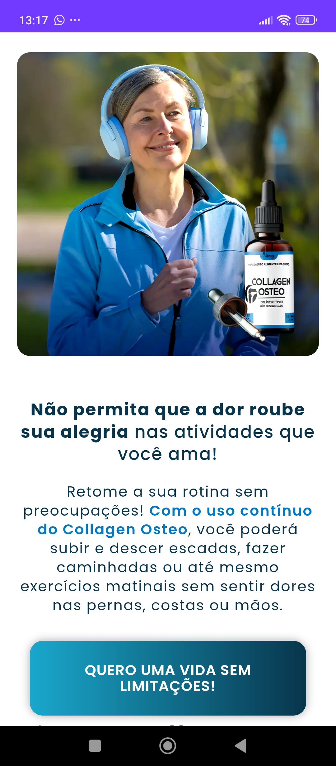 Colágeno Osteo é um suplemento alimentar desenvolvido para auxiliar na saúde dos ossos, articulações e cartilagens. Sua fórmula combina colágeno hidrolisado com vitaminas e minerais importantes para fortalecer o organismo e melhorar a mobilidade no dia a dia. O colágeno é uma proteína essencial para o corpo, responsável por ajudar na estrutura dos ossos, pele, tendões e ligamentos. Com o passar dos anos, a produção natural diminui, e a suplementação pode ajudar a repor essa proteína. ✔ Auxilia na saúde dos ossos e articulações ✔ Contribui para fortalecimento das cartilagens ✔ Pode ajudar na redução de dores articulares ✔ Ajuda na saúde da pele, cabelos e unhas Ideal para pessoas que desejam melhorar a qualidade de vida, fortalecer as articulações e manter o corpo mais saudável. 📦 Produto lacrado 💊 Fácil de consumir no dia a dia