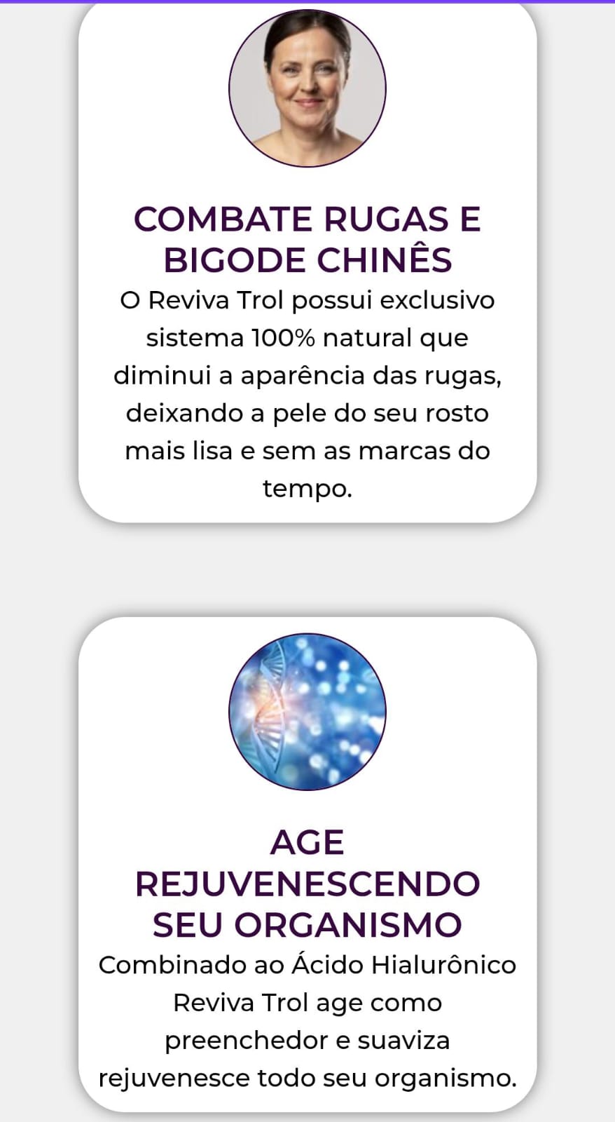 Reviva Trol é um suplemento alimentar desenvolvido para ajudar no rejuvenescimento da pele e no cuidado com a beleza de dentro para fora. Sua fórmula reúne ingredientes conhecidos por contribuir para a saúde da pele, cabelos e unhas, ajudando a manter uma aparência mais jovem e saudável. � Venha Saúde - Melhor informação. Entre os componentes da fórmula estão resveratrol, ácido hialurônico, colágeno, retinol e biotina, nutrientes que atuam na hidratação da pele, na melhora da elasticidade e no combate aos sinais do envelhecimento. � Venha Saúde - Melhor informação. Com o uso regular, o suplemento pode auxiliar na redução de rugas e linhas de expressão, melhora da firmeza da pele e aumento da hidratação, contribuindo para uma aparência mais revitalizada. � Reviva Trol Benefícios ✨ Auxilia na redução de rugas e linhas de expressão 💧 Contribui para hidratação e firmeza da pele 🌿 Ajuda a combater os sinais de envelhecimento 💅 Fortalece cabelos e unhas ⚡ Pode contribuir para bem-estar e vitalidade 📦 Frasco com 60 cápsulas 💊 Uso prático no dia a dia.