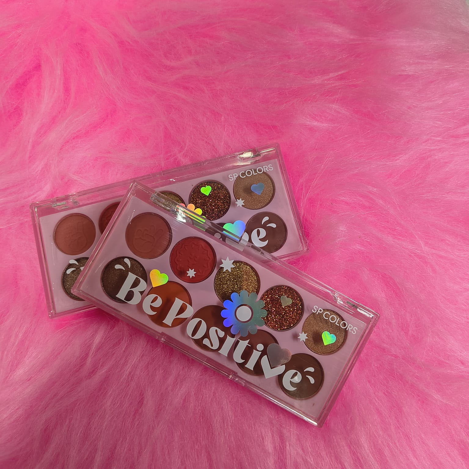A linha Be Positive da SP Colors é composta por paletas de sombras (versões A e B) e produtos de maquiagem focados em alta pigmentação, texturas macias e embalagens fofas em tons de rosa e lilás, com design "paz e amor"