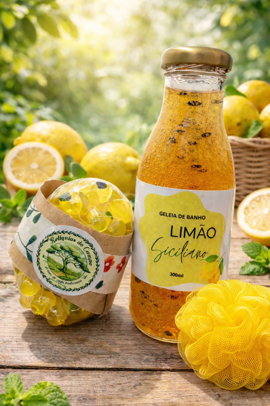 O presente ideal para presentear o seu amado. - Sabonete Massageador de Maracujá - Sabonete Gel de Limão Siciliano - Bucha de banho Amarela