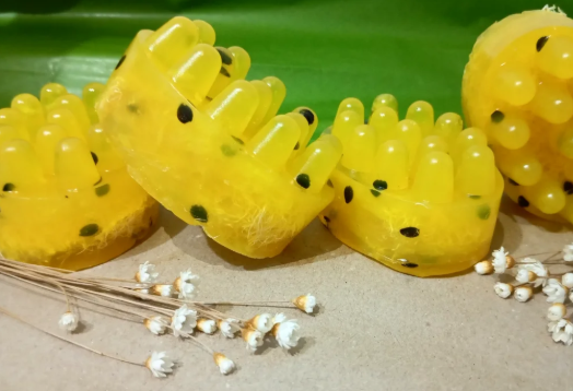Sabonete Artesanal Massageador de Maracujá com bucha vegetal oferece hidratação profunda, esfoliação suave e estimulação da circulação sanguínea, aliviando tensões musculares. Insumos: - Extrato de Aloe vera: ação calmante e hidratante - Base Glicerina: hidratação suave - Lauril: Espuma suave - Essência de Maracujá: aroma refrescante - Corante: fins decorativo - Semente desidratada de maracujá: esfoliante e decorativo